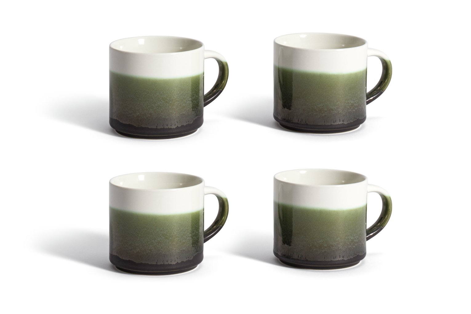 These reactive glaze stoneware mugs are laid back chic at its finest. Glazed a gorgeous dark green at the base, the colour tapers up slowly, lightening into a white rim & white inside. The wide shape & generous handle mean it happily balances on the edge of your favourite arm chair. Stylish enough to look special but durable enough for every day, theyre microwave, dishwasher, freezer & even oven safe. Pair with matching serving bowls from the Another Eden collection & make your next coffee morning a cool affair. Everyday chic. Stylish enough to look special but durable enough for every day, theyre is microwave, dishwasher, freezer & even oven safe. Thats the beautiful durability of stoneware. Pair with matching serving bowls from the Another Eden collection & make your next coffee morning a cool affair. If only biscuits were this stylish. Made from stoneware. 4 mugs. 310ml/10fl.oz capacity. Dishwasher safe, microwave safe & freezer safe. Manufacturers 1 year guarantee.