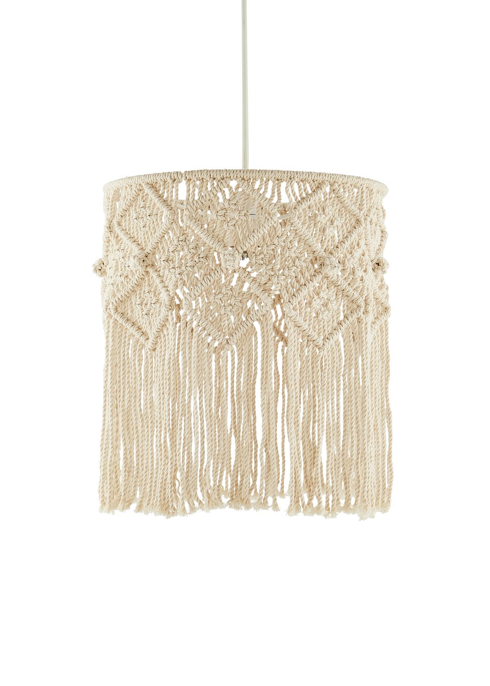 A knotted touch. Add a boho vibe to your room with our calming, cream-coloured macrame pendant light shade. This textured shade casts an atmospheric glow throughout the room. Made from cotton the diamond design & flowing tassels are bang on trend. A perfect friend to hang with. Use with environmentally friendly LED bulbs. No assembly is required, no need for an electrician. Simply attach to an existing ceiling rose & switch on for a beautiful glow. Made from cotton. Recommended wattage: 10