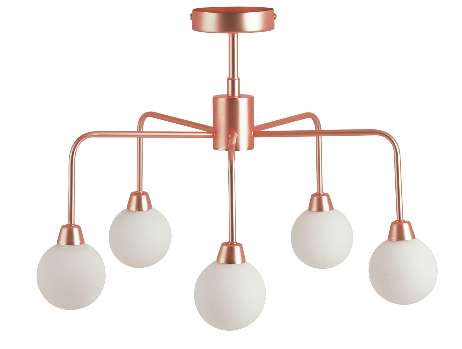 Finished in copper finish with five opal glass shades, its an ideal lamp for adding ambience to a room without dominating the space. Size H37.5, W51.8, D51.8cm. Diameter 51.8cm. Suitable for use with low energy bulbs. IP rating 20not suitable for bathroom use. Self-assembly. Product is mains powered. Assembly required. Requires wiring. Rated bulb life 25000 hours. Bulbs required 5 x capsule G9 LED (not included). Recommended maximum wattage: 4 watts. Manufacturers 1 year guarantee.