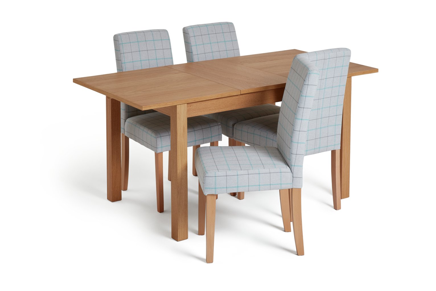 Perfect for the heart of your home. Set the table in seconds with the Habitat Clifton extendable dining table. Its got an easy-glide end leaf extension. When youre getting ready for guests, simply slide the extra sections out & click them into place. Featuring a real oak veneer finish, the Clifton has a smooth, natural style & is easy to wipe clean after meals. The Clifton comes with 4 midback chairs with charming check fabric & sturdy solid beech legs. Tuck into family feasts or linger over drinks with friends, at this delectable dining set. Part of the Clifton collection. Table: Table size H74, W80, L120cm. Size of table extended L160cm. Removable table extension piece. Centre leaf extension type. Real wood veneer table with real wood veneer legs. Wood veneer table top finish. Self-assembly