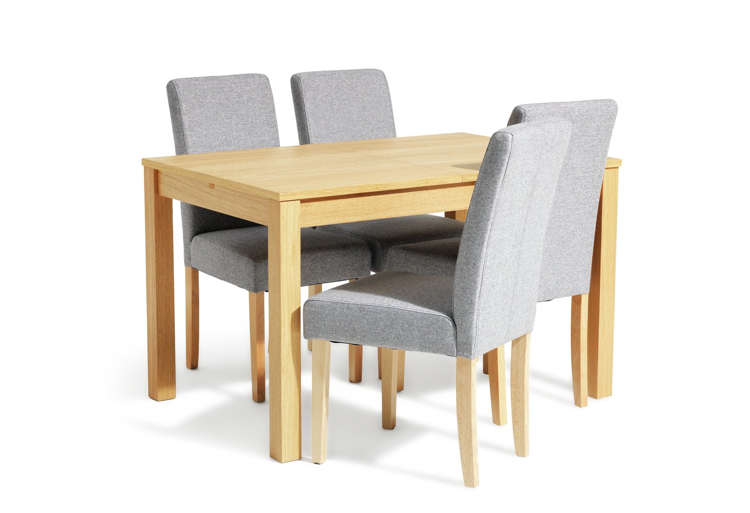 Perfect for the heart of your home. Set the table in seconds with the Habitat Clifton extendable dining table. Its got an easy-glide end leaf extension. When youre getting ready for guests, simply slide the extra sections out & click them into place. Featuring a real oak veneer finish, the Clifton has a smooth, natural style & is easy to wipe clean after meals. The Clifton comes with 4 midback chairs with tactile grey tweed fabric & sturdy solid beech legs. Tuck into family feasts or linger over drinks with friends, at this delectable dining set. Part of the Clifton collection. Table: Table size H74, W80, L120cm. Size of table extended L160cm. Removable table extension piece. Centre leaf extension type. Real wood veneer table with real wood veneer legs. Wood veneer table top finish. Self-assembly