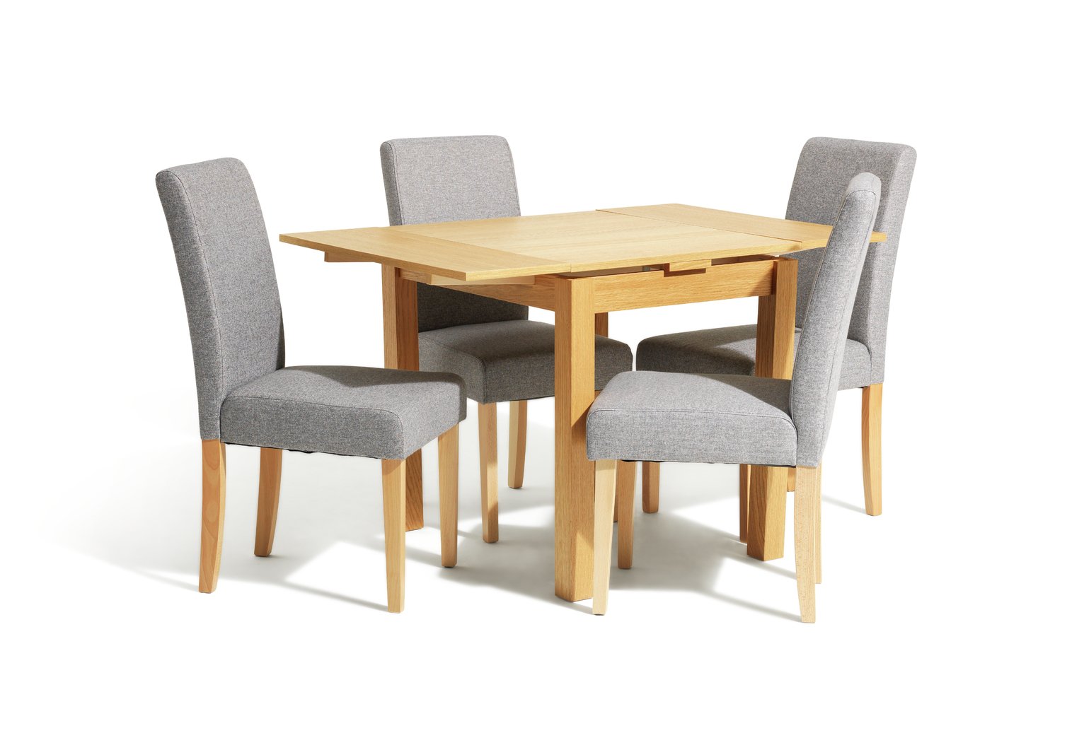 Perfect for the heart of your home. Set the table in seconds with the Habitat Clifton extendable dining table. Compact when out of use, it features an easy-glide end leaf extension. So, when youre getting ready for guests, simply slide the extra sections out & click them into place. Featuring a real wood veneer finish, the Clifton has a smooth, natural style & is easy to wipe clean after meals. The Clifton comes with 4 midback chairs with tactile grey tweed fabric & sturdy solid beech legs. Tuck into family feasts or linger over drinks with friends, at this delectable dining set. Part of the Clifton collection. Table: Table size H75.3, W80, L66cm. Size of table extended L120cm. Integral table extension. End leaf extension type. Real wood veneer table with real wood veneer legs. Wood veneer table top finish. Self-assembly