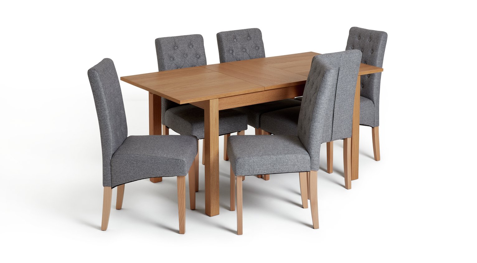 Perfect for the heart of your home. Set the table in seconds with the Habitat Clifton extendable dining table. Its got an easy-glide end leaf extension. When youre getting ready for guests, simply slide the extra sections out & click them into place. Featuring a real oak veneer finish, the Clifton has a smooth, natural style & is easy to wipe clean after meals. The Clifton comes with 6 midback chairs with tactile grey tweed fabric & sturdy solid beech legs. Button back detailing makes the perfect finishing touch. Tuck into family feasts or linger over drinks with friends, at this delectable dining set. Part of the Clifton collection. Table: Table size H74, W80, L120cm. Size of table extended L160cm. Removable table extension piece. Centre leaf extension type. Real wood veneer table with real wood veneer legs. Wood veneer table top finish. Self-assembly