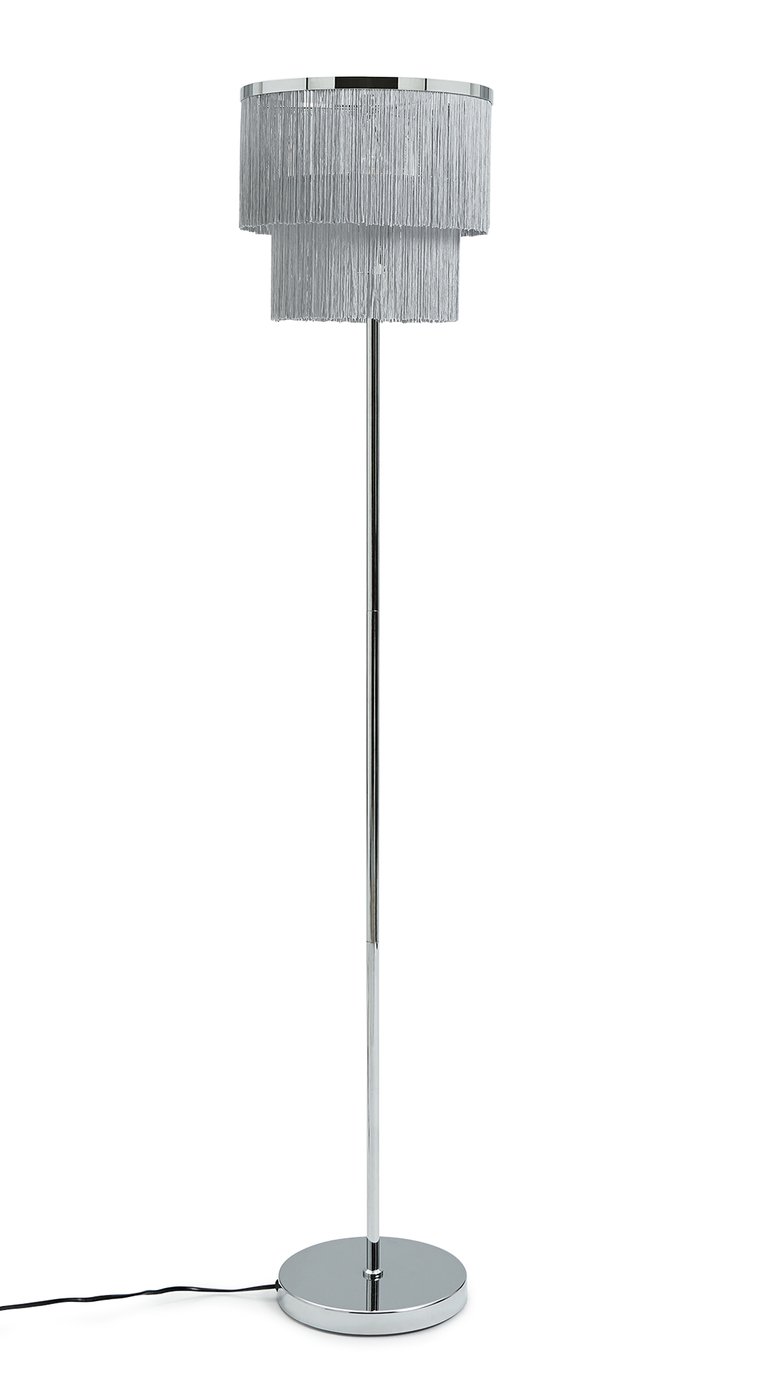 We think this tall floor lamp is simply the bees knees. Just like a Twenties flapper dress, the two layers of elegant grey fringe on the round shade add a retro touch & cast a soft glow in your living room. A slender stem & circular base in silver chrome bring a modern twist to the vintage inspired design. Tap the foot switch to turn it on & have a swell time. Pair this light with our cushions & throws in corduroy, velvet & metallic fabrics to add a ritzy finish to your soft furnishings. Complete the mid century look with our range of simple statement pieces, including sofas, sideboards & occasional tables. Vintage style has never looked so good. Height 151cm x Diameter 30cm. Diameter of base 30cm. Shade diameter 30cm x 30cm height. Bulb required 1 x classic E27 edison screw LED (not included). 10 watts. In-line switch. Not suitable for bathroom use. Minimal assembly. Product is mains powered. Cord length 1.5m. A++ energy rating. Weight 2.5kg. Manufacturers 1 year guarantee.