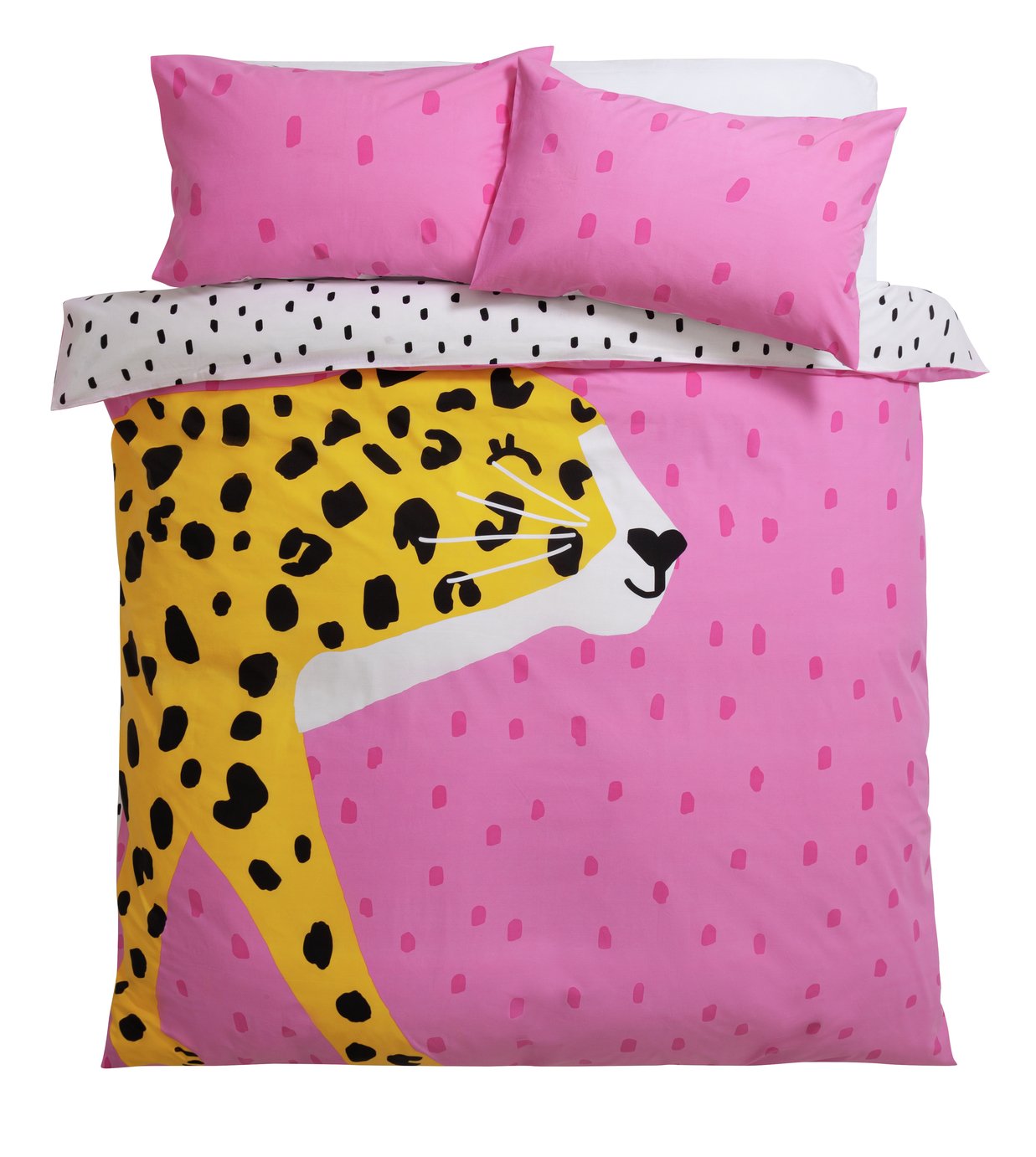 Show off your wild side with this playful leopard print bedding set. Featuring a vibrant pink leopard design on one side & charming leopard spots on the other, you can switch up your decor whenever the mood strikes. Crafted in a polycotton blend, machine wash & tumble dry your bedding with little to no ironing required afterwards. Bring the savannah to your bedroom with this whimsical, fun design. Set