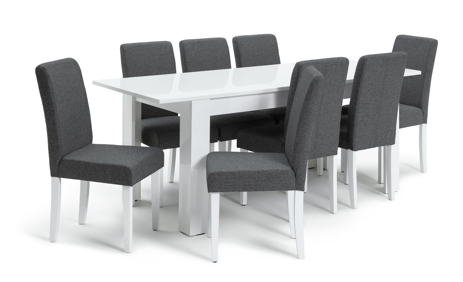 Includes:: 8 midback chairs with tactile grey tweed fabric & sturdy solid beech legs in white. Tuck into family feasts or linger over drinks with friends, at this delectable dining set. Part of the Miami collection. Table: Table size H76.7, W80, L160cm. Size of table extended L200cm. Removable table extension piece. Centre leaf extension type. Wood effect table with wood effect legs. Gloss table top finish. Self-assembly