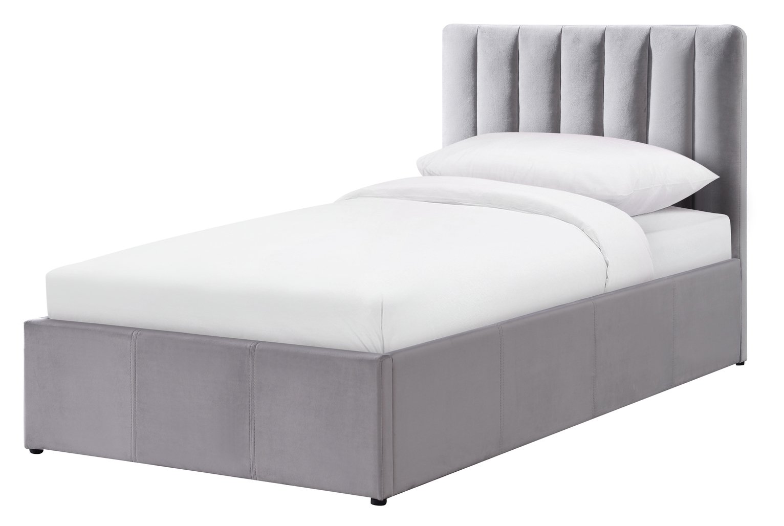 - it gives a great foundation for your single mattress of choice. Available with or without storage, this ottoman version has loads of storage space underneath, perfect for seasonal linens & clothes that you need to hide away. The end access gas lift mechanism makes it easy to open, & the sprung wooden slatted base provides additional comfort & support. Available in a choice of blush or grey. Part of the Pandora collection. Made from polyester. Fabric frame. Base with sprung wooden slats. Ottoman storage. Ottoman: end opening. Storage capacity: 470 litres. Size W101.5, L204, H101cm. Height to top of siderail 32cm. 1cm clearance between floor & underside of bed. Weight 41kg. Maximum user weight 160kg. Self-assembly