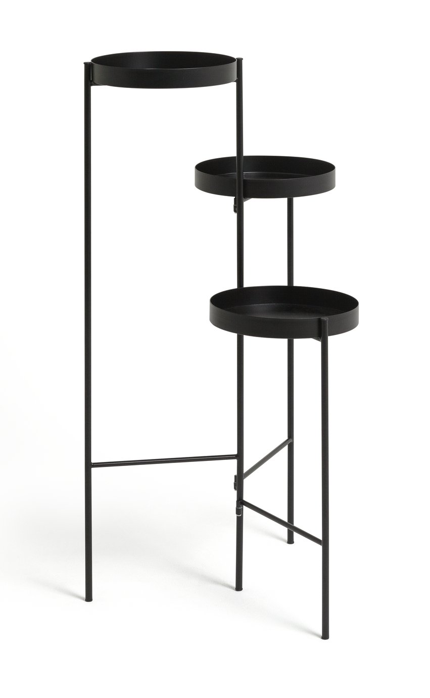 Knock em dead with this gorgeous black metal side table. Three tray-like tops at varying heights create an eye-catching focal point. This cool design can be styled with table lamps, plants or decorative vases. Play around a bit to create the perfect display. Put it next to your favourite armchair, or jazz up a forgotten corner of a room. Cleverly created to simply fold together when not needed. Thats smart. Foldable design. Size H 75, W 37, D 38.5cm. Made from steel with a metal finish. Weight 1.83kg. General information: Fully assembled