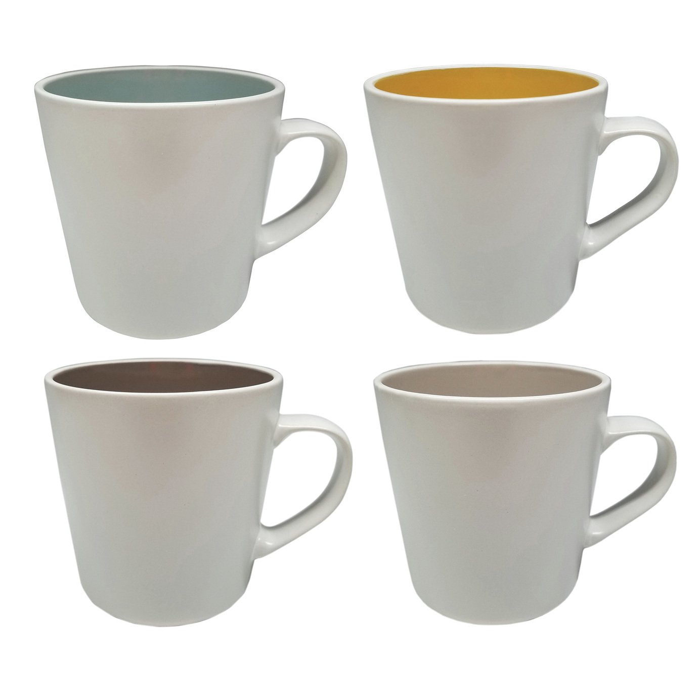Put the kettle on&33; These stunning, tapered stoneware mugs each feature a colourful, glossy interior. Theyre beautifully finished on the outside with a tactile, matt glaze. Perfect for cradling a hot beverage. Very artisan. Gorgeously Boho. Theyll soon be family favourites. But dont worry, theyre dishwasher & microwave proof&33; How many sugars&63; Made from stoneware. 4 mugs. 360ml/12fl.oz capacity. Dishwasher safe & microwave safe. EAN: 5054331163694. Manufacturers 1 year guarantee.