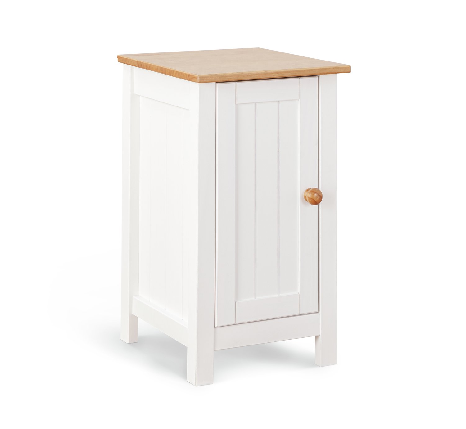 A nod to the Nordic. Our Scandinavia Collection represents the best of the interiors trend. Simplicity, function, connection to the natural world. This slim, solid pine bedside chest comes with a generous cupboard space, ideal for keeping all your essentials out of sight. Phones, books, jewellery, chargers finally have their own home. Painted white with contrasting pine top & button handle, this table has charm. The table has a lacquered layer on top to create a smooth, hardwearing finish. Decorate it with family photos or a candle collection. Theres a small clearance from the floor, so you can even get the vacuum under there. Part of the Scandinavia collection. made from pine. Wooden handles. Additional handles not included. 1 door. 1 fixed shelf. Self-assembly