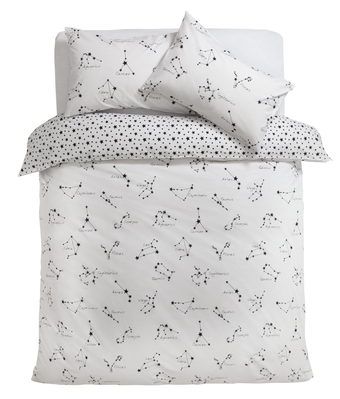 Summer nights never felt so inviting with our fresh textured-print duvet set. One side features a multitude of subtle stars. For a different look, just flip over & sleep under a constellation of stars on a cool white background. Made from a comfy wrinkle-resistant poly-cotton blend its a doddle to wash. Simply tumble dry, shake out & put straight on your bed. No ironing required. With a matching pillowcase well create a fabulous new feel for your bedroom. Its soft, comfortable & breathable qualities are perfect for a great zzzz. Set