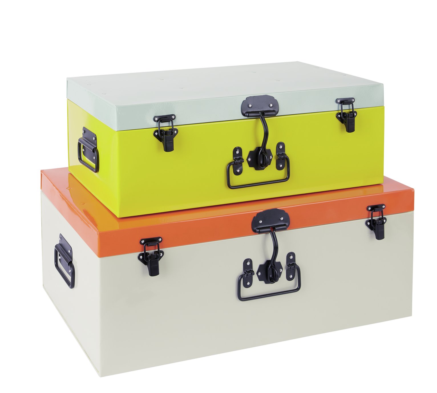 Handmade & hand finished, the Tasha set of 2 multi-coloured trunks combine a vibrant colour palette with a clever design & offer a practical storage solution for your home. Made from powder-coated metal, these trunks are created by bending iron sheets over templates to create its statement finish & straight edged design. Finished with black metal clasps, Tasha is perfect for storing towels, throws & those other bits & bobs you dont want on display. Small box size H18, W27, D49cm. Medium box size H23, W34, D57cm. Manufacturers 1 year guarantee. EAN: 5056382016677.