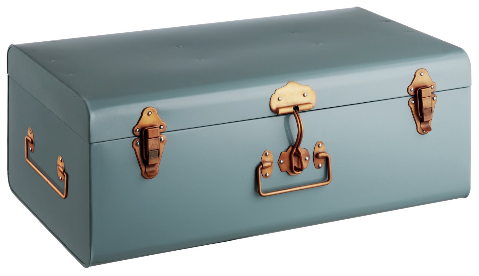 Banish unsightly clutter with this attractive storage solution. Keeping everything out of sight & dust-free, this blue metal storage box has a generous capacity & will blend in seamlessly with any decor. Featuring contrasting copper accents, it makes a great feature in any room. Particularly handy for storing bedding, towels, seasonal linen, clothes or toys, its stackable & has side handles for easy carrying. The storage trunk is also available in other sizes & colours, so why not double up & find a home for all your bits & bobs. Small box size H23, W58, D35cm. Fully assembled. General Information: We are excited to be welcoming some of our favourite HOME products into the Habitat range. Your product may arrive in Habitat or HOME packaging. Manufacturers 1 year guarantee. EAN: 5053721439296.