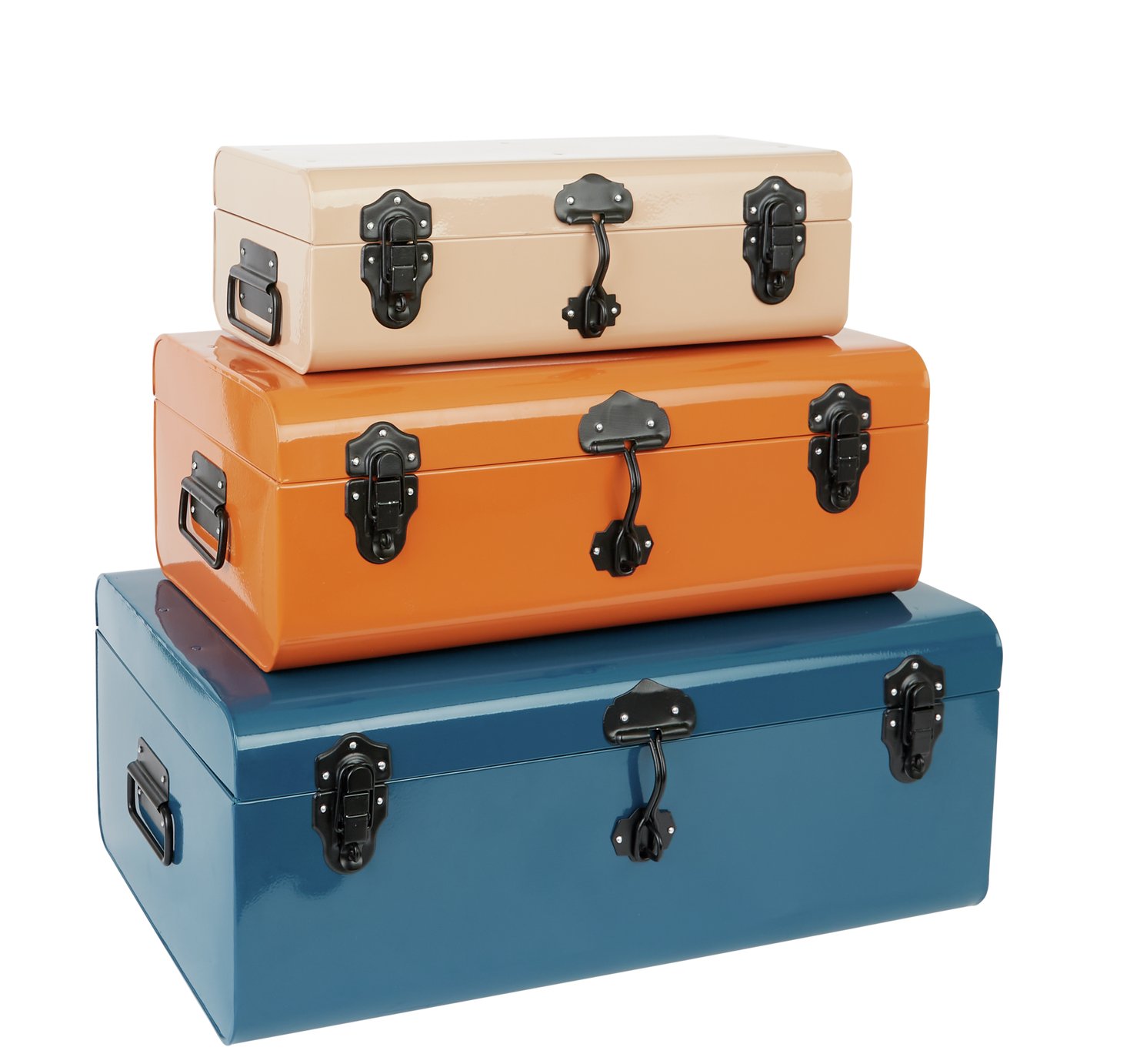 - offers a modern twist on a vintage storage solution. Handmade from powder-coated metal, the trunks come in a large, medium & small size & combine bold colours with black accent clasps & side handles for a stylish yet practical design. Stackable to make the most of your space, the trunks are great for storing bedding, towels, clothing & more, whilst keeping your belongings dust free. Small box size H13, W31, D21cm. Medium box size H17, W49, D27cm. Large box size H20, W57, D35cm. Manufacturers 1 year guarantee. EAN: 5056382016660.