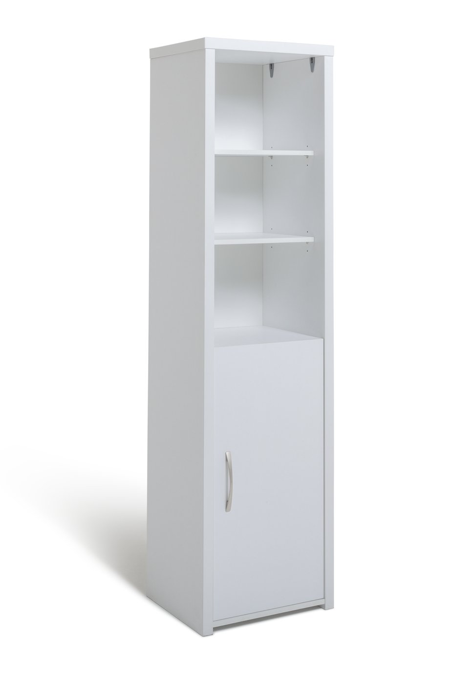 Fill that empty space with this characterful display cabinet. Designed to last, this unit from the Habitat Venice collection has a solid, chunky design. Its finished in a fresh white. It lives to serve. The open shelving means that you can exhibit those treasured trinkets & beloved ornaments. Or maybe a book or ten. The cupboard is just the ticket for hiding away files & paperwork. Its finished with a contemporary bow handle. Practical & pretty. Part of the Venice collection. Size H183.5, W48.9, D39.1cm. 32kg. Maximum load weight of 55kg. 5 shelves made from wood effect including 1 fixed shelves 4 adjustable shelves. 1 doors. Silver-coloured metal handles. Self-assembly
