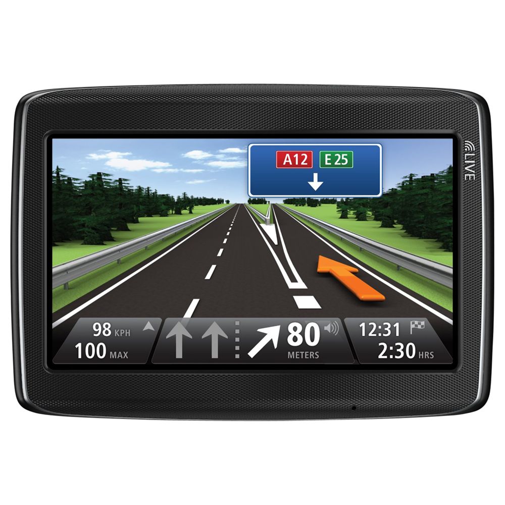 - a good deal better than panicked suggestions from the passenger seat! The GO LIVE 825 navigation system is compatible with Tom Tom’s LIVE service (requires subscription). This helps you drive smarter with a live connection to the most up-to-date real time route information (such as traffic information, weather forecasts, safety alerts, latest fuel prices, etc.); saving you time, money & most importantly, stress! You can even find shops & businesses close to where you are thanks to Google Local Search. The 5” widescreen is anti-glare, with an inbuilt-sensor automatically adjusting brightness so you’ll always be able to see any of the built-in Europe & UK & Republic of Ireland maps or pre-loaded points of interest. The unit can double as a hands free kit thanks to its Bluetooth connectivity ; make & receive calls as you drive with just a touch of the screen. Finally, a high quality lithium-polymer battery provides up to 2 hours of continuous product use. The unit can be also charged in car as your drive with the supplied 12-24V cigarette lighter adapter, so you’ll never have an excuse for getting lost. The package