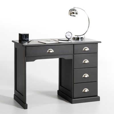 Betta solid pine desk. Keep things neat & tidy with this simple desk with clean lines, offering plenty of storage. Description of Betta desk: 4-drawer cabinet. 1 centre drawer below the desk top. Features of Betta desk: Untreated solid pine suitable for painting, natural varnished, walnut stained or white stained. Nitrocellulose varnish finish. Fibreboard back covered in decorative paper. Silver-coloured metal shell handles for the untreated & white versions & copper-coloured for the natural & walnut versions. See other items from the Betta collection online. Size of Betta desk: Overall size.: Width 106cm Height 75.5cm Depth 50cm. Internal