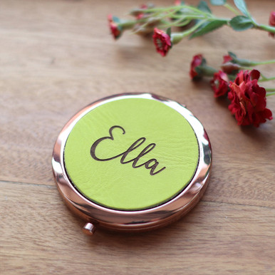 Check your reflection & touch up your make-up on the go with this glamorous rose gold effect mirror. This mirror is the perfect pocket-sized companion to accompany you everywhere from overnight stays, travel trips & nights out on the town. To make things even better, this compact mirror can be personalised. Choose one from a selection of leather colours (lime, natural, pink (Out of Stock), peach or grey) & add a name of up to 12 characters to have laser engraved on to the leather. This compact mirror would be a great gift for any travel set or handbag. If this sounds like something you'd like to get for someone you know, or a gift for yourself, why not order the Personalised Laser Engraved Compact Mirror today!