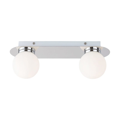 Flush light suitable for bathrooms with two opal white glass orb shades on a polished chrome back plate. Install either horizontally or vertically, as a wall or ceiling light.