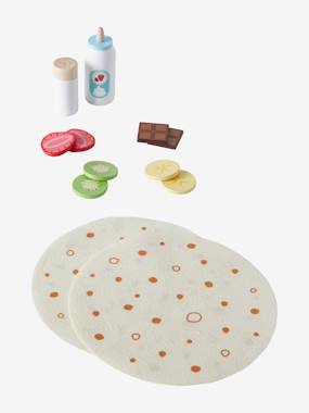 Includes:: 2 felt crepes; 2 banana slices, 2 kiwi slices, 2 strawberry slices, & 2 chocolates squares, all in wood. 1 spray cream & 1 wooden jar of sugar.