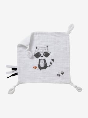 This fun & cute square baby comforter will soon become baby's best friend. Your baby will love to touch & observe the little contrasting ribbons. This Raccoon baby comforter in soft & delicate fabric is comforting for baby! DIMENSIONS: 30 x 30 cm White baby comforter with raccoon + little paws & leafs Comforter features 4 knots 4 little ribbons on the side 1 side plain MORE INFORMATION: Suitable from birth Soothes the baby Stimulates the sense of touch Creates an emotional bond Square baby comforter toy in cotton fabric, Raccoon