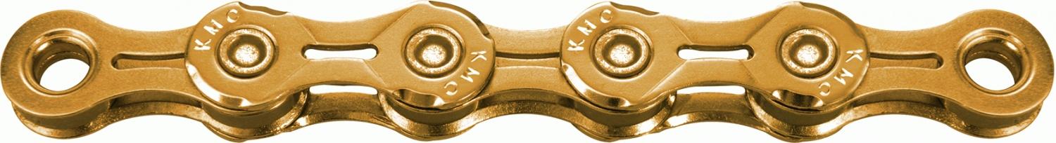 KMC X11-SL Gold 11 Speed Chain: This 11 speed chain is compatible with all Campagnolo 11 speed systems. Comes with 11 speed missing link. 1/2" x 11/128" - 112 Links Pin length 5, 5 mm Titanium Nitride Gold coated Double X Durability Super Light, 228g only ...