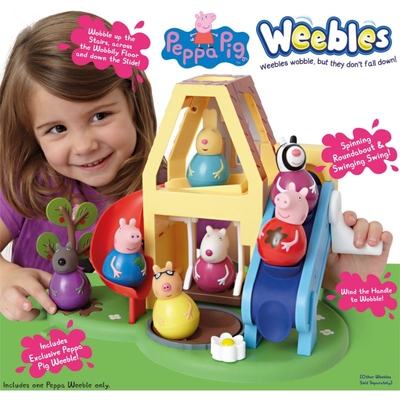 Wobbily Playhouse! Wind the handle to move Peppa up and then down she slides... splash into the muddy puddle! Push Peppa on the swing and turn the daisy to move the roundabout. An exclusive Peppa Weeble included (1 figure supplied).